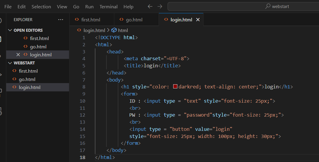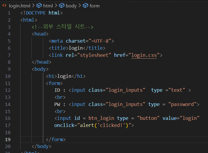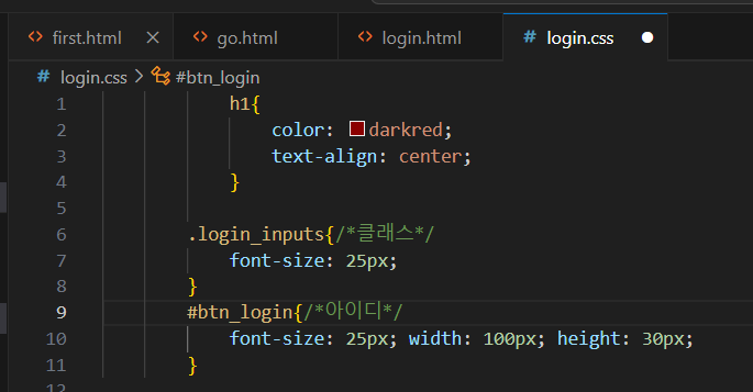 - html파일에 <link rel="stylesheet" href="login.css"> 작성 후 연결