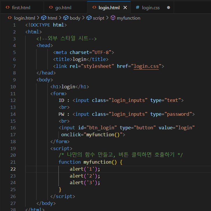1) 인라인 : HTML태그 안에 같이 작성 , 사용자와의 상호작용이 있을 때만 가능. 예를 들어, 버튼을 클릭 했을때, 키보드를 눌렀을때.