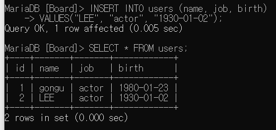 -공란으로 insert -> Default설정 해둔 기본 값이 insert