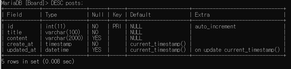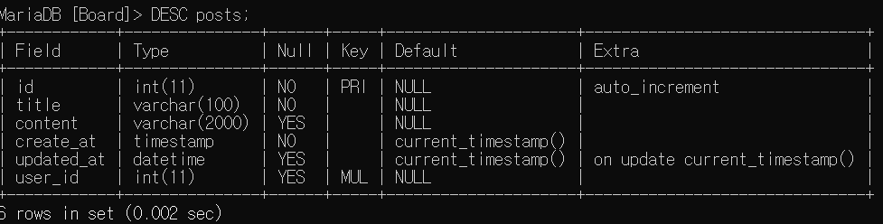 ?? : ALTER TABLE posts MODIFY create_at TIMESTAMP NOT NULL DEFAULT CURRENT_TIMESTAMP;을 추가